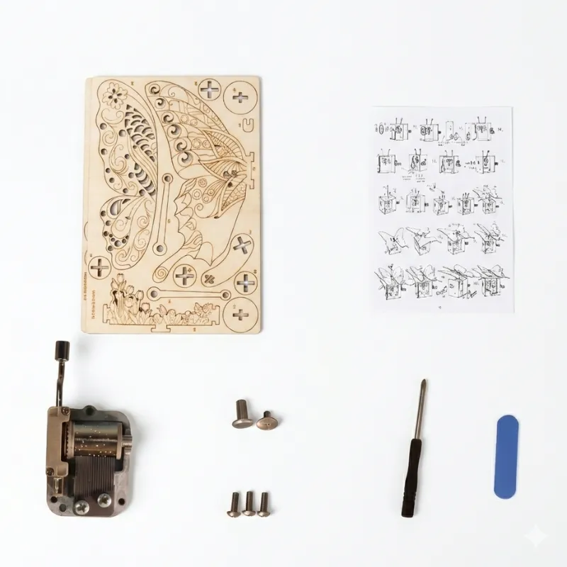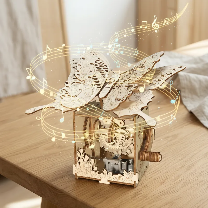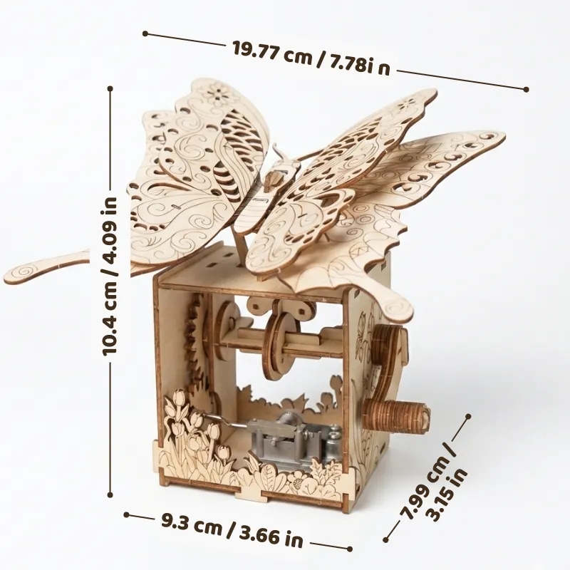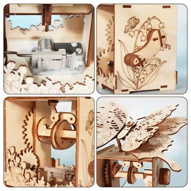 This wooden puzzle was fun to build and looks awesome. The butterfly spins and plays music—my friends love watching it during playdates.