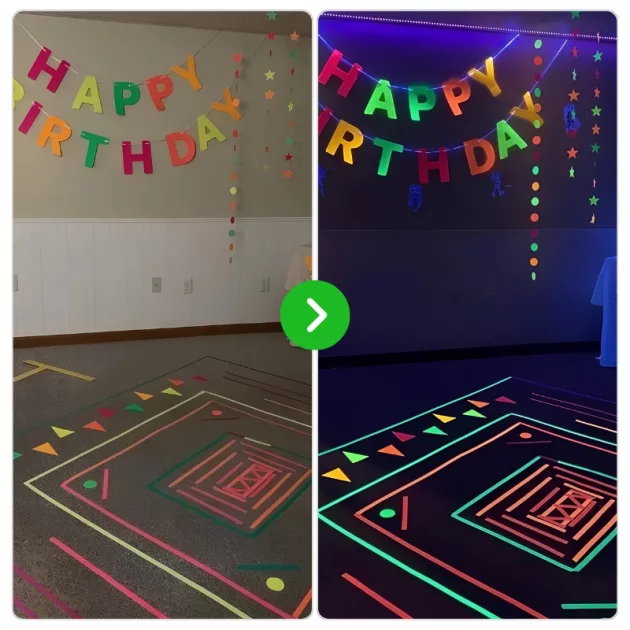My sister and I made a glowing hopscotch in our basement with these neon strips. The colors were really bright and cleanup was quick.
