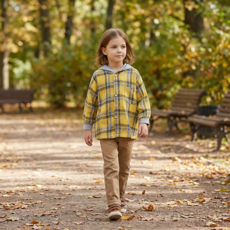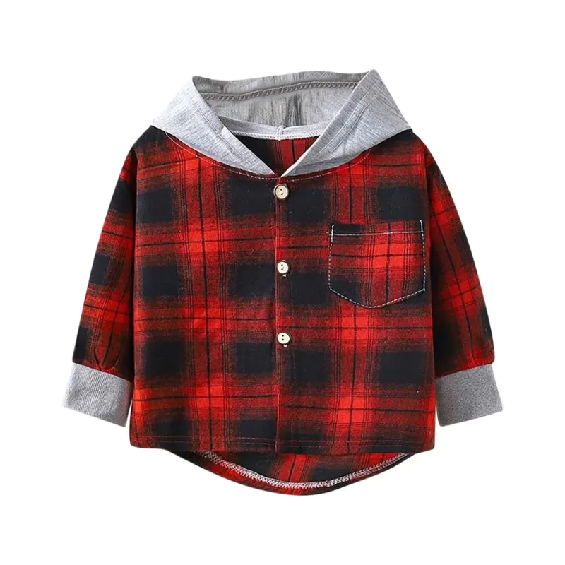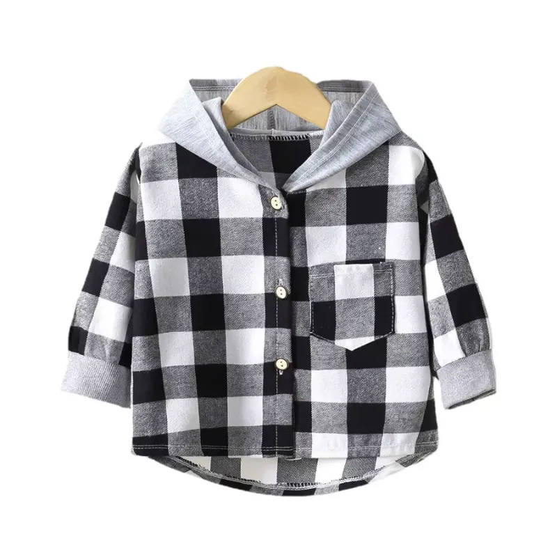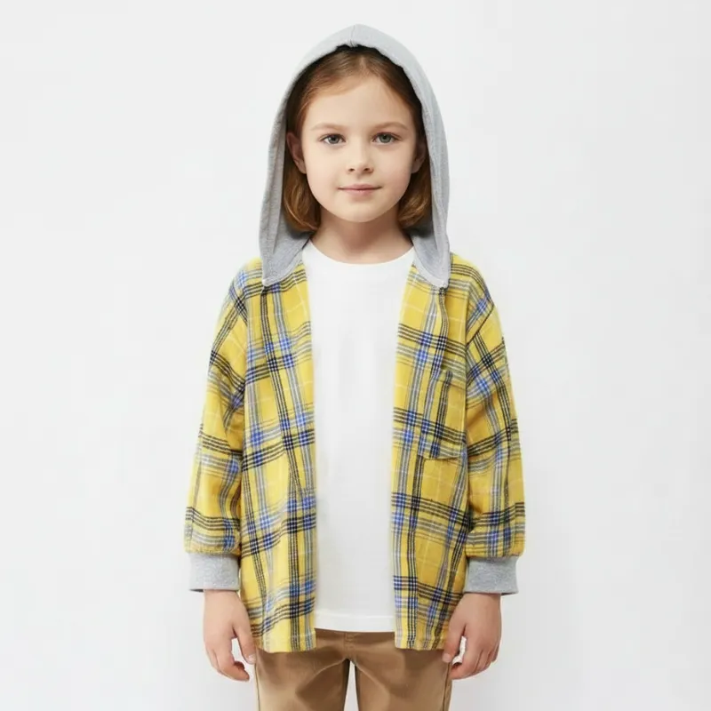 Cotton Plaid Button-Up Hooded Shirt for Kids